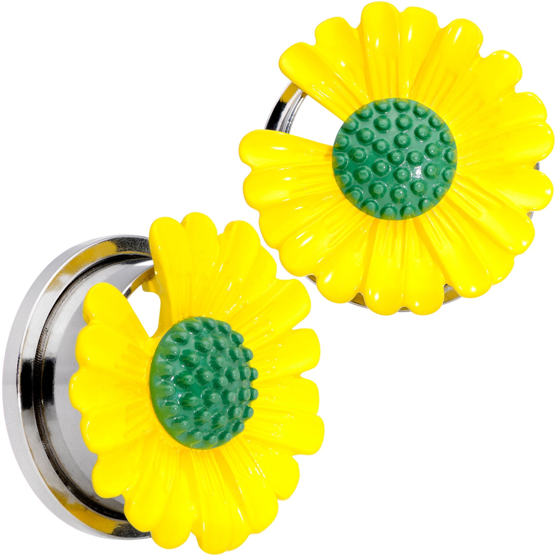 Let the daisies on these plugs decorate your stretched lobes in colorful style! They're made with 316L surgical grade stainless steel and each one features a three-dimensional green and yellow flower charm on the front. They also feature a screw fit design that combines easy insertion with secure wear for a fit you're going to love. Your earlobes will blossom with these delicious daisies in them! Sold as a set of two.Specifications